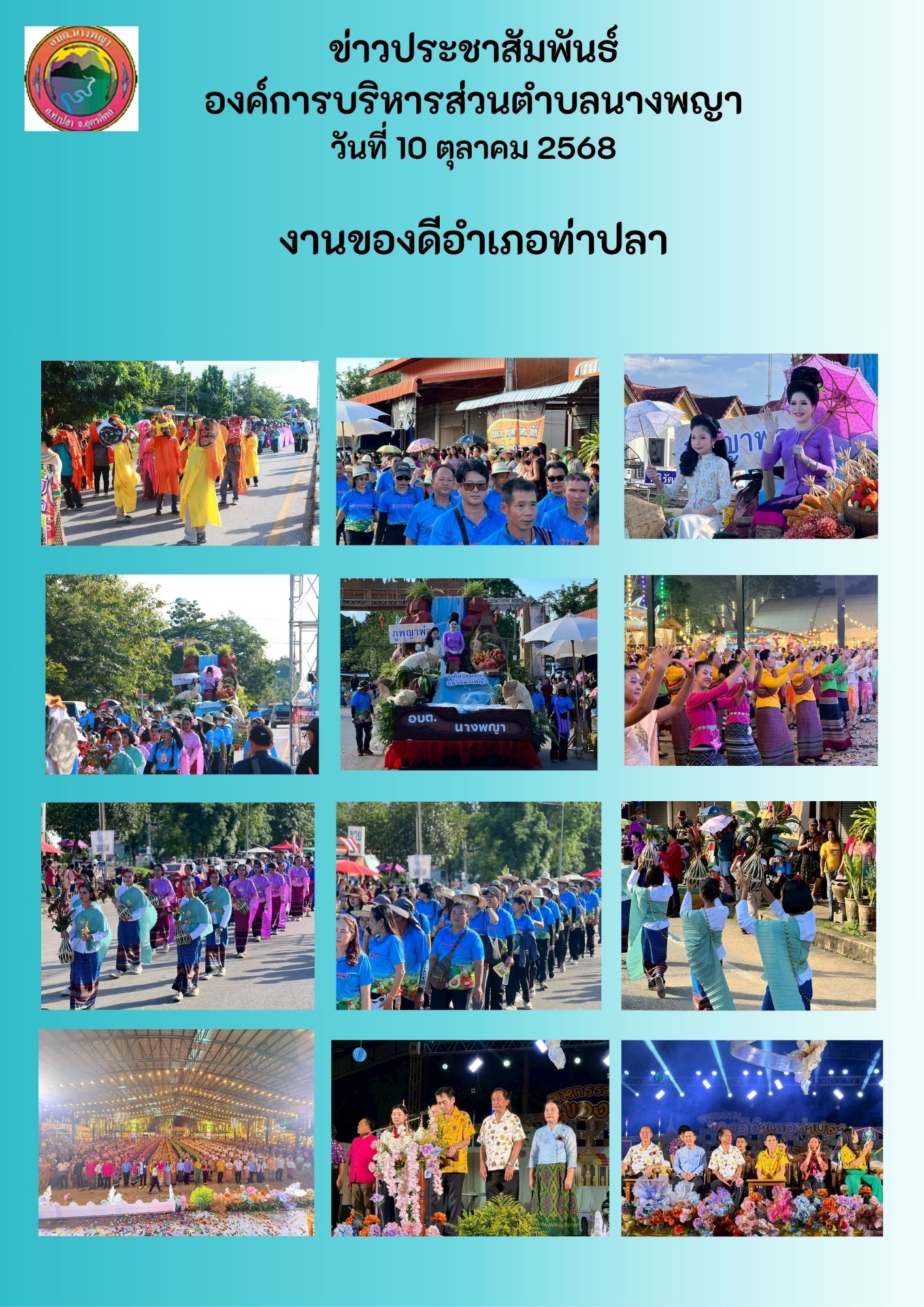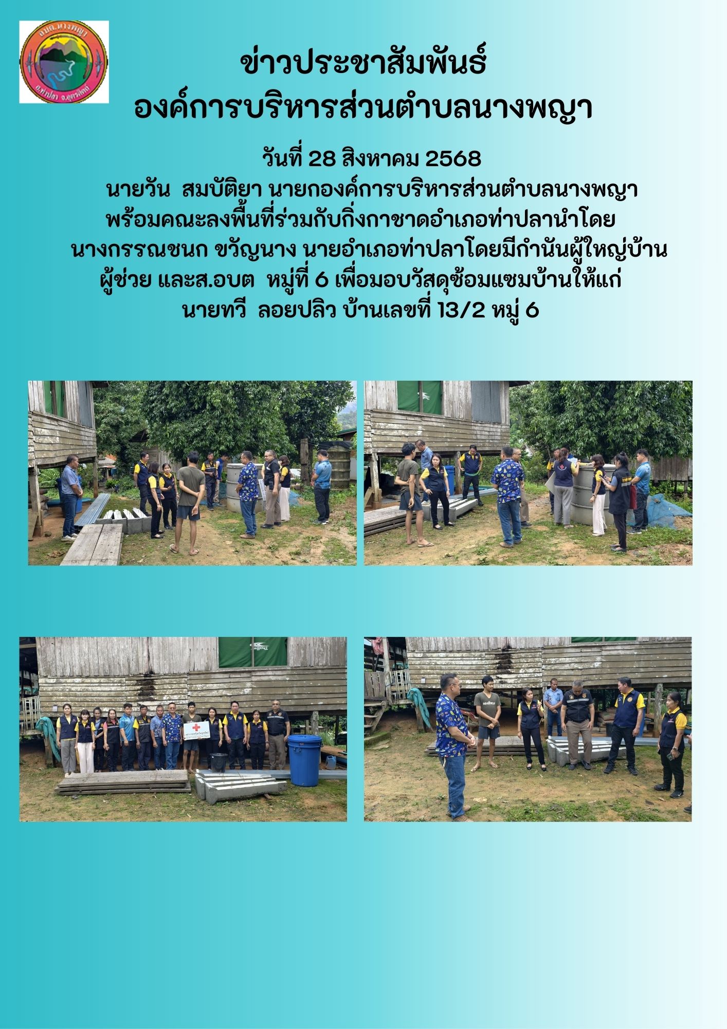 นายวัน สมบัติยา นายกองค์การบริหารส่วนตำบลนางพญา พร้อมคณะลงพื้นที่ร่วมกับกิ่งกาชาดอำเภอท่าปลานำโดย นางกรรณชนก ขวัญนาง นายอำเภอท่าปลาโดยมีกำนันผู้ใหญ่บ้าน ผู้ช่วย และส.อบต หมู่ที่ 6 เพื่อมอบวัสดุซ้อมแซมบ้านให้แก่ นายทวี ลอยปลิว บ้านเลขที่ 13/2 หมู่ 6